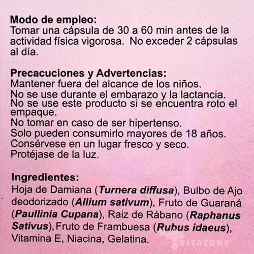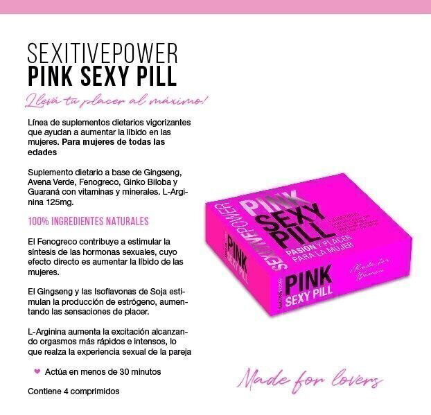 Línea de suplementos dietarios vigorizantes que ayudan a aumentar la líbido en las mujeres.100% ingredientes naturales. Suplemento dietario a base de Gingseng, Avena Verde, Schizandra, Ginko Biloba y Guaraná con vitaminas y minerales. L-Arginina 125 mg. El Gingseng y las Isoflavonas de Soja estimulan la producción de estrógeno, aumentando las sensaciones de placer. L-Arginina aumenta la excitación alcanzando orgasmos más rápidos e intensos, lo que realza la experiencia sexual de la pareja. Actúa en menos de 30 minutos. Contiene 4 comprimidos
